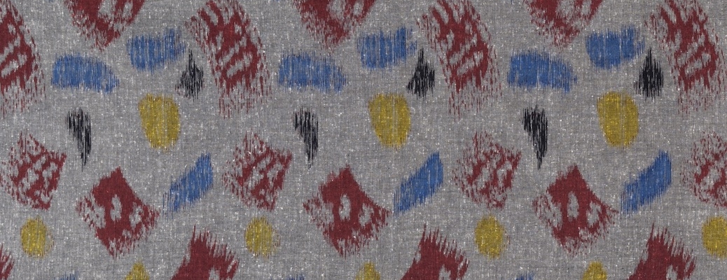 Mérida is named for the Mexican city where Leguillon encountered a small bar with walls painted in thick strokes of red, blue, yellow, and black. In the Japanese city of Yame, the artist reproduced the mural in the distinctive brushed patterns of kasuri textile with master craftsman Kyōzō Shimogawa (下川強臓).